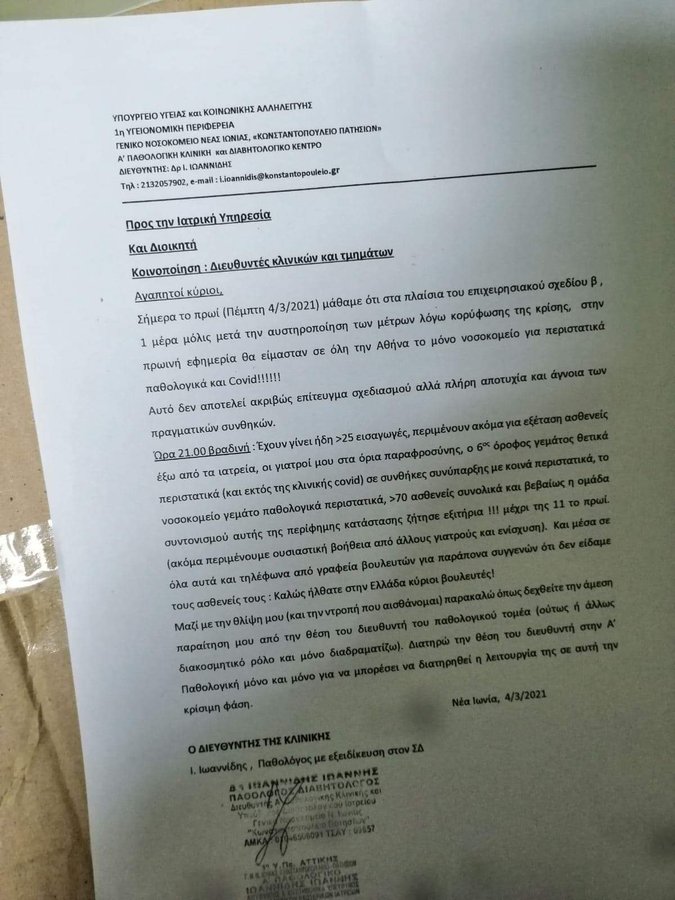 Στο νοσοκομείο Νίκαιας οι Διευθυντές Ιατρικής Υπηρεσίας, Παθολογικού Τομέα και Χειρουργικού Τομέα «επέδωσαν έγγραφό τους στον διοικητή, όπου αναφέρουν, πως είναι αδύνατον λόγω ελλείψεων σε στελέχωση και σε υποδομές το νοσοκομείο να νοσηλεύει πάνω από 100 ασθενείς COVID-19» ανέφερε ο νευροχειρούργος στο Γενικό Νοσοκομείο Νίκαιας – Πειραιά και μέλος της Ομοσπονδίας Νοσοκομειακών Γιατρών (ΟΕΝΓΕ).